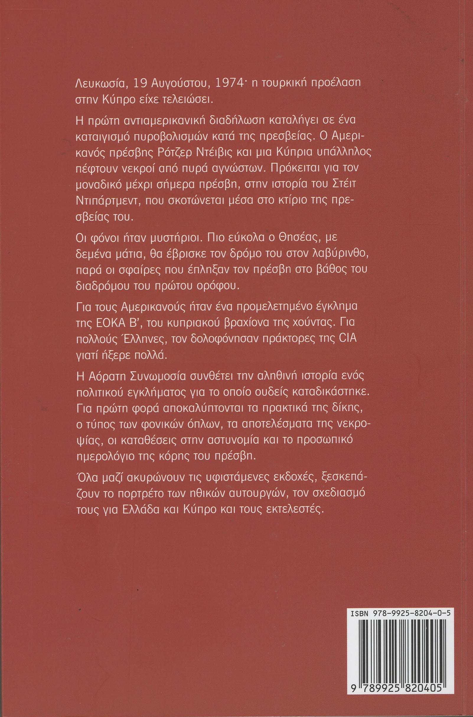 Η Αόρατη Συνωμοσία συνθέτει την αληθινή ιστορία ενός πολιτικού εγκλήματος για το οποίο ουδείς καταδικάστηκε. Για πρώτη φορά αποκαλύπτονται τα πρακτικά της δίκης, ο τύπος των φονικών όπλων, τα αποτελέσματα της νεκροψίας, οι καταθέσεις στην αστυνομία και το προσωπικό ημερολόγιο της κόρης του πρέσβη.