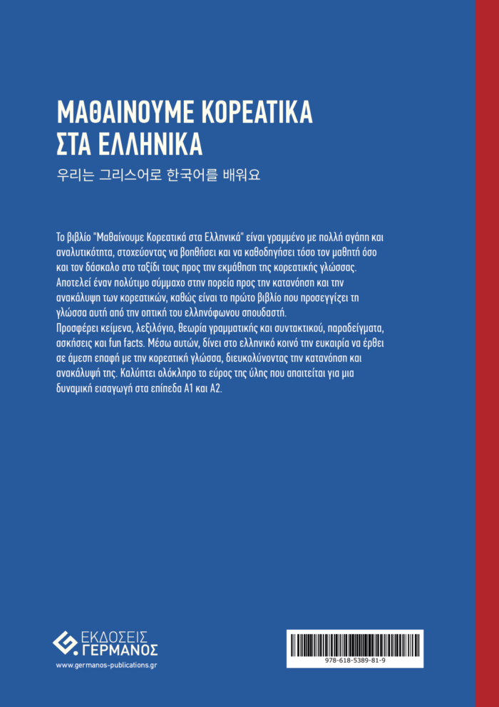 Το βιβλίο “Μαθαίνουμε Κορεατικά στα Ελληνικά” είναι ο απόλυτος οδηγός για κάθε ελληνόφωνο που θέλει να μάθει κορεατικά. Σχεδιασμένο με αγάπη και προσοχή, περιλαμβάνει αναλυτικά κείμενα, πλούσιο λεξιλόγιο, θεωρία γραμματικής και συντακτικού, παραδείγματα, ασκήσεις και διασκεδαστικά στοιχεία που εμπλουτίζουν τη μάθηση. Επικεντρώνεται στις ανάγκες των αρχάριων μαθητών, καλύπτοντας πλήρως τα επίπεδα Α1 και Α2.