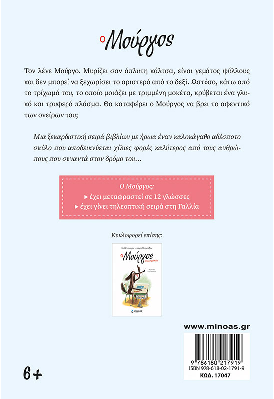 Τον λένε Μούργο. Μυρίζει σαν άπλυτη κάλτσα, είναι γεμάτος ψύλλους και δεν μπορεί να ξεχωρίσει το αριστερό από το δεξί. Ωστόσο, κάτω από το τρίχωμά του, το οποίο μοιάζει με τριμμένη μοκέτα, κρύβεται ένα γλυκό και τρυφερό πλάσμα. Θα καταφέρει ο Μούργος να βρει το αφεντικό των ονείρων του; Μια ξεκαρδιστική σειρά βιβλίων με ήρωα έναν καλοκάγαθο αδέσποτο σκύλο που αποδεικνύεται χίλιες φορές καλύτερος από τους ανθρώπους που συναντά στον δρόμο του…