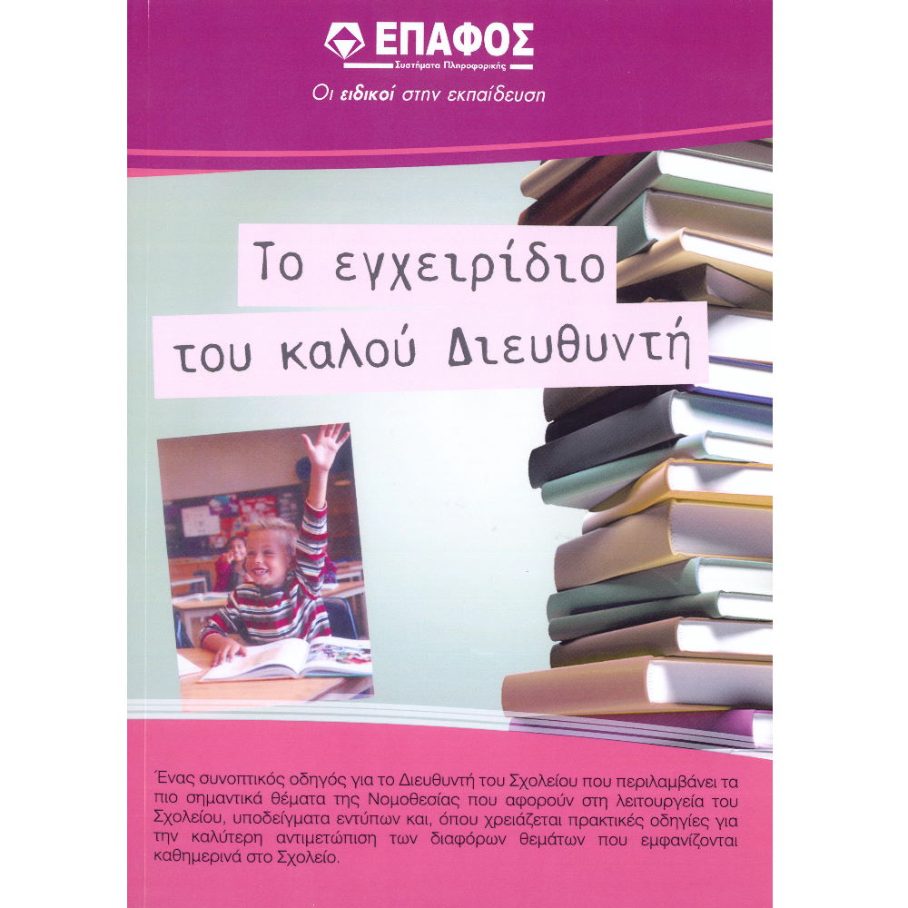 Το “Εγχειρίδιο του καλού διευθυντή” είναι ο απόλυτος οδηγός για την ορθή λειτουργία του Δημοτικού Σχολείου. Βασική ανάγκη των Διευθυντών, προϊσταμένων αλλά και των δασκάλων είναι η ύπαρξη ενός συνοπτικού οδηγού για το Διευθυντή του Σχολείου που να περιλαμβάνει τα πιο σημαντικά θέματα της Νομοθεσίας που αφορούν στην καθημερινή λειτουργία του Σχολείου, να περιέχει τα πιο χρήσιμα υποδείγματα εντύπων και να δίνει πρακτικές οδηγίες για την καλύτερη αντιμετώπιση των διαφόρων θεμάτων που αντιμετωπίζονται καθημερινά στο Σχολείο.